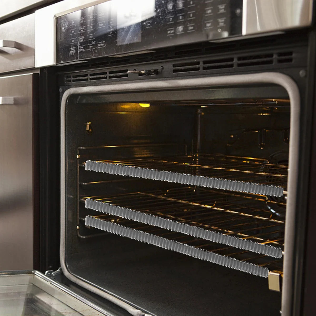 - La instalación es simplemente deslizándose en el borde de los protectores largos del estante del horno y el forro de silicona se agarra en su lugar. Puedes cortar la longitud de nuestro producto de acuerdo a tus necesidades. Fácil de limpiar, apto para lavavajillas.