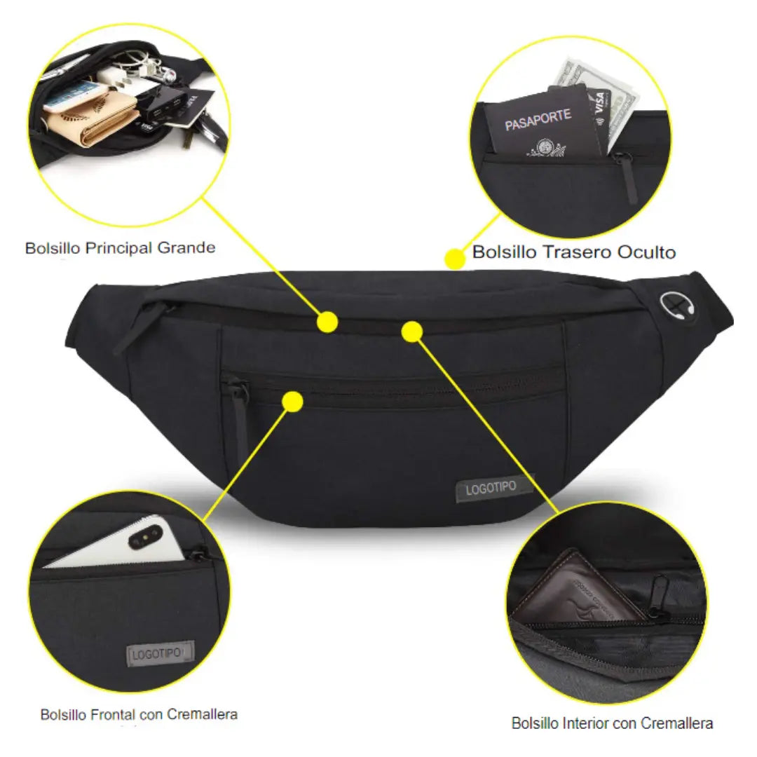 - La riñonera grande hace varias actividades con las manos libres. Con 4 (cuatro) bolsillos con cremallera perfectos para la mayoría de las personas que quieren tener las manos libres para llevar los artículos más necesarios, incluyen todos los tamaños de teléfono, pasaporte, llaves, identificación y otros artículos pequeños.